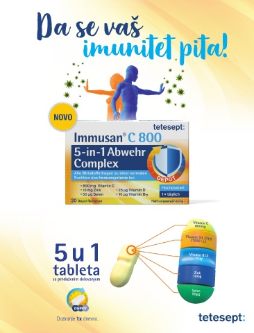 Da se vaš imunitet pita! NOVO Vitamin C 800mg Vitamin D3 25μg (1000 i.j.) 5 u 1 Vitamin B12 10μg tableta Zink sa produženim delovanjem 10mg Selen 55μg Doziranje 1x dnevno.
